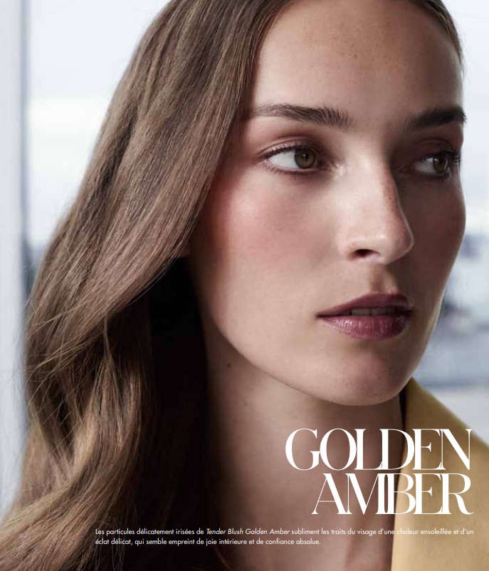 - Golden Amber : Le jeu des contrastes. Un look au charme irrésistible qui joue sur les accents chauds et froids. Le Tender Blush Golden Amber apporte une chaleur ensoleillée aux pommettes et aux paupières , tandis que les lèvres se parent du violet profond du Sensual Lipstick 8243 Purple Gem, sublimé par la brillance miroir du Lip Shine.
